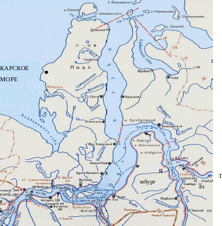 Обская губа (см. рисунок 5) представляет собой ориентированный в меридиональном направлении и глубоко вдающийся в сушу (протяженность более 890 км, ширина 30-90 км) залив Карского моря, к которому с востока примыкает Тазовская губа (протяженность более 310 км). Эти губы вместе составляют закрытое устьевое взморье, которое является единым для впадающих в него рек Обь, Надым, Пур и Таз.
