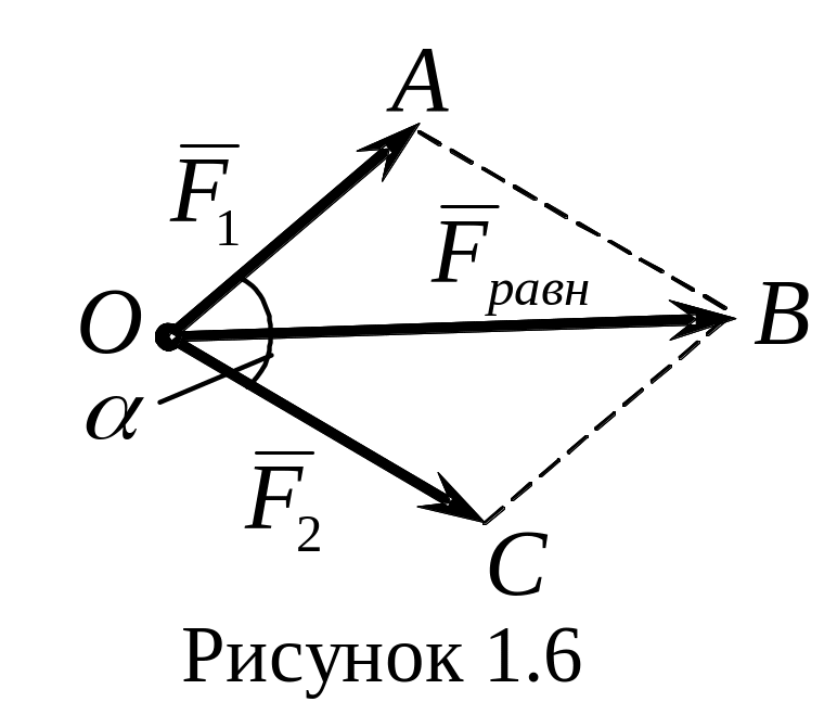 Величина равнодействующей силы и ее направление определяется соответственно по теореме косинусов, т.е. равнодействующая двух сил, выходящих из одной точки, выходит из этой же точки и равна диагонали параллелограмма, построенного на данных векторах (рисунок 1.6)
