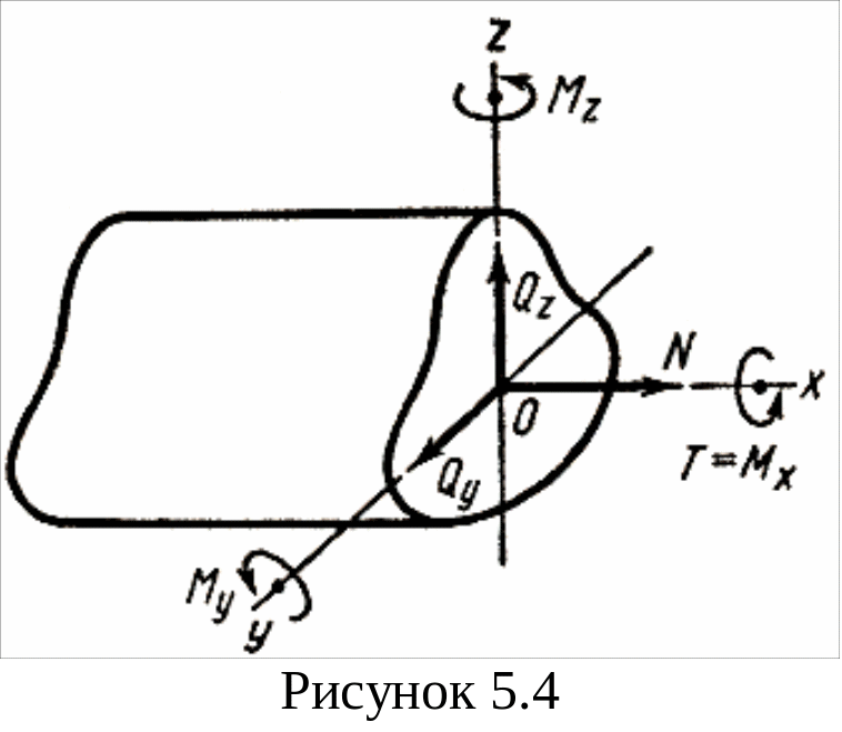 По характеру создаваемой деформации силовые факторы называют осевой силой N, поперечными силами Qy и Qz, крутящим моментом T, изгибающими моментами My и Mz.