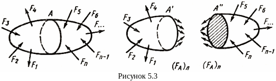 Внутренние усилия определяют методом сечений, который состоит в следующем: если тело находится в равновесии, то его левая и правая части относительно воображаемой поверхности раздела тоже находятся в равновесии (рисунок 5.3).