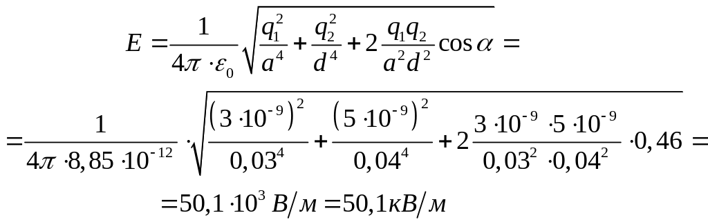 Пример 1. Заряды q1 = 3 нКл и q2= -5 нКл находятся на расстоянии r = 6 см друг от друга. Определить напряженность Е и потенциал φ в точке, находящейся на расстоянии a = 3 см от первого заряда и d = 4 см от второго заряда. Какой силой потребуется удержать в этой точке заряд q 3 = 1 нКл?