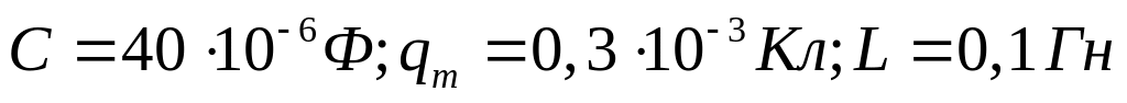Пример 13. Конденсатору емкостью 40 мкФ сообщен заряд 0,3 мКл, после чего его замыкают на катушку с индуктивностью 0,1 Гн. Пренебрегая сопротивлением контура, найти законы изменения напряжения на конденса