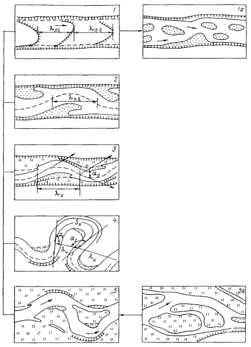1 - ленточногрядовый, 2 - побочневый, 3 - ограниченное меандрирование, 4 - свободное меандрирование, 5 - незавершенное меандрирование, 5а - поименная многорукавность, 1а - русловая многорукавность; lлг - шаг ленточных гряд, lпб - шаг побочней, lн - шаг излучины, a0 - угол разворота излучины, SИ - длина излучины, a1 - угол входа, a2 - угол выхода, a0 = a1 + a2