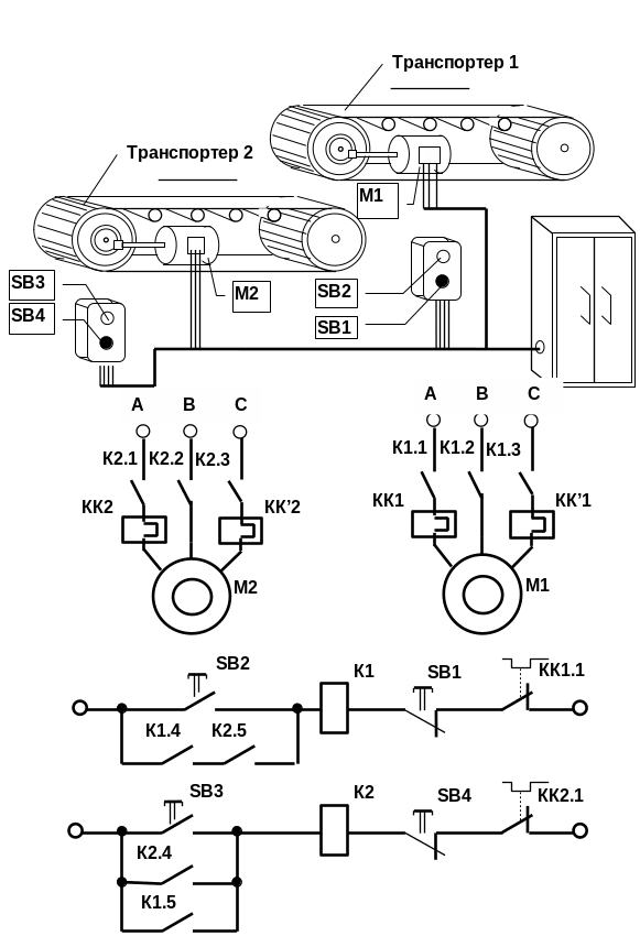 Как изменится работа схемы управления транспортерами, если элементы К1 и K2.5 поменять в схеме местами ?