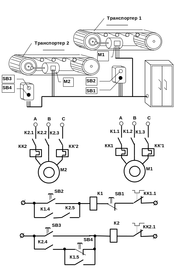 Как изменится работа схемы управления транспортерами, если элементы К1.1 и К1.2 поменять в схеме местами ?