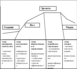 Динамическая группа включает следующие этапы: внедрение, рост, зрелость, насыщение, спад и крах. Организацию, находящуюся в динамической группе, называют динамической организацией (таб. 7).