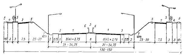 1 - основная проезжая часть; 2 - местные и боковые проезды; 3 - предохранительные и краевые полосы; 4 - тротуары; 5 - разделительные полосы и полосы озеленения; 6 - предохранительный брус; 7 - кабели освещения и связи