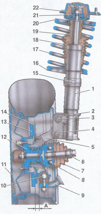 А контрольный размер; 1 - телескопическая стойка; 2 - гайка; 3 - эксцентриковый болт; 4 - гайка; 5 - поворотный кулак; 6 - вал привода переднего колеса; 7 - защитный чехол шарнира; 8 - наружный шарнир вала; 9 - нижний рычаг; 10 - шаровая опора; 11 - декоративный диск (колпак) колеса; 12 - ступица; 13 - тормозной диск; 14 - защитный кожух; 15 - поворотный рычаг; 16 - нижняя опорная чашка; 17 - пружина подвески; 18 - защитный чехол телескопической стойки; 19 - буфер хода сжатия; 20 - верхняя опорная чашка; 21 - подшипник верхней опоры; 22 - верхняя опора стойки