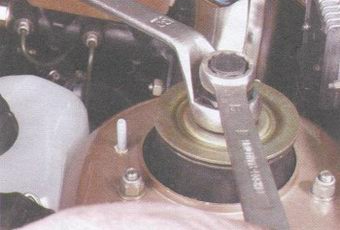 2. Ослабляю специальным ключом гайку верхнего крепления штока амортизатора. Я пользуюсь специальным ключом для гайки верхнего крепления амортизатора. Без него довольно трудно ослабить гайку амортизатора.