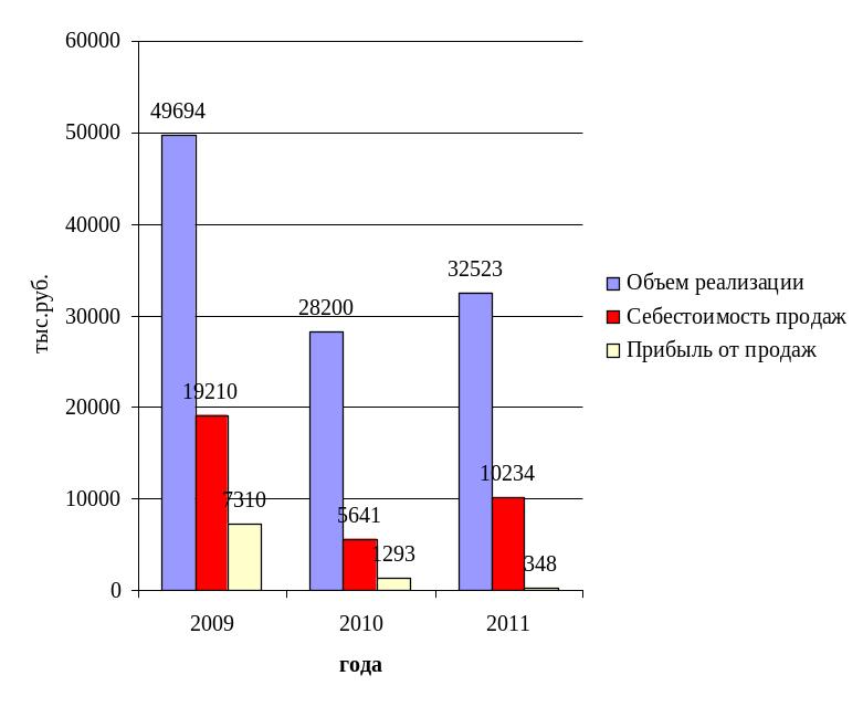 Общее снижение прибыли от продаж с 7310 тыс.руб. в 2009 г. до 1293 тыс.руб. в 2010г., составив по итогам отчетного 2011 года 348 тыс.руб. составило 6962 тыс.руб. или 4,76% от уровня 2009 года.