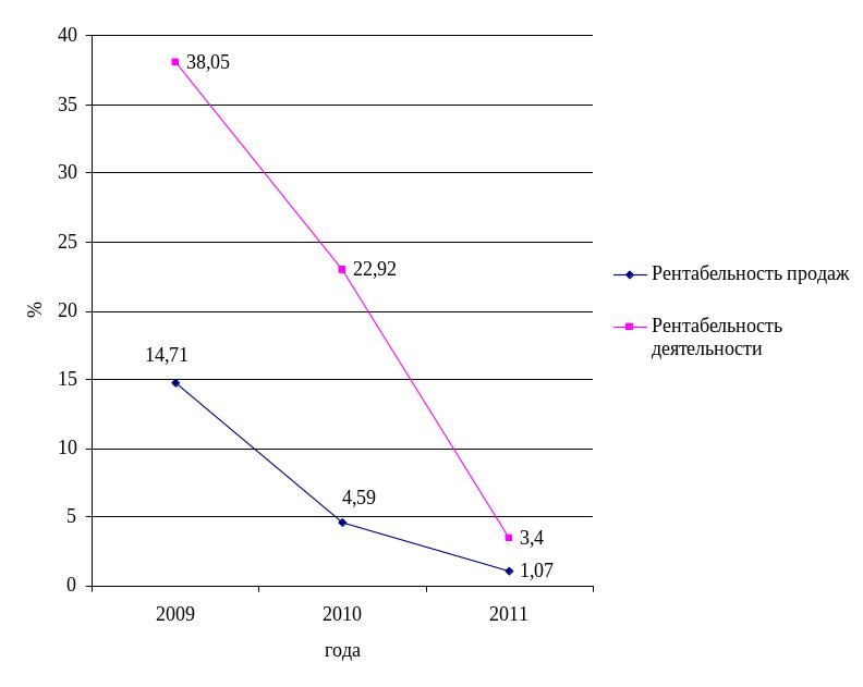 Отрицательная динамика прибыльности основной деятельности сказалась на снижении показателей рентабельности продаж с 14,71% в 2009 г. и 4,59% в 2010 г. до 1,07% по итогам 2011 г., т.е. на 13,64%, а также рентабельности осуществления хозяйственной деятельности в целом с 38,05% в 2009 г. и 22,92% в 2010 г. до 3,4% в 2011 г., т.е. на 34,65% (рис. 4).