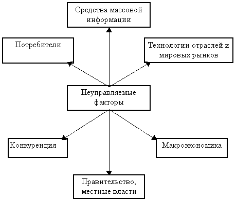 К неуправляемым факторам (Рис. 4) относятся характеристики маркетинговой внешней среды и рынка сбыта, рассмотренные в предыдущей главе.