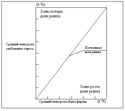 Если фирма стремиться удержать рыночную долю, то она должна увеличивать объемы сбыта со скоростью, не меньше скорости роста самого рынка (нижняя часть графика).