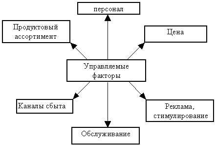 К управляемым факторам относятся следующие маркетинговые инструментарии (Рис. 3): цена, свойства товара, его дизайн, упаковка, торговая марка, методы сбыта и коммуникации, сервис, позиционирование, выбор целевого сегмента.