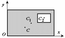 3. Метод отрицательных площадей. Частный случай способа разбиения (рис.9). Он применяется к телам, имеющим вырезы, если центры тяжести тела без выреза и вырезанной части известны. Тело в виде пластинки с вырезом представляют комбинацией сплошной пластинки (без выреза) с площадью S1 и площади вырезанной части S2 .