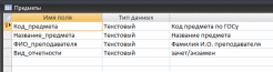 Код_предмета – четырехзначный код предмета в соответствии с ГОС. Код предмета уникален для каждого предмета, это поле должно быть ключевым. Тип данных – текстовый.