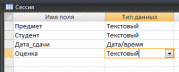Таблица «Сессия» содержит следующие поля: предмет – при заполнении таблицы будет выбираться из списка названий предметов; студент – будет выбираться из списка фамилий студентов; дата сдачи; оценка.