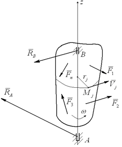 Пусть на твердое тело, имеющее неподвижную ось вращения z (рисунок 3.4), действует система заданных внешних активных сил (F1, F2, F3,...,Fn ), определяющих угловую скорость ω и угловое ускорение ε этого тела в его вращательном движении вокруг оси z. Одновременно на это же тело действуют силы реакции RA подпятника иRB радиального подшипника.