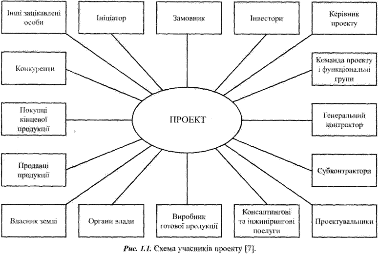 До числа учасників можуть входити інвестори, банки, підрядчики, постачальники, гуртові покупці продукції, лізингодавці та інші фізичні чи юридичні особи. Учасником проекту може бути також держава (рис. 1).
