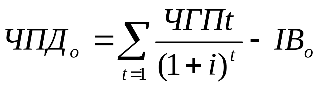 де ЧГПt – сума чистого грошового потоку за окремими інтервалами загального періоду експлуатації інвестиційного проекту (якщо загальний період експлуатації визначити важко, то він приймається t=Tз=5 років); ІВо – сума одноразово інвестованих витрат для реалізації інвестиційного проекту; i – дисконтна ставка; n – кількість інтервалів у загальному розрахунковому періоді t.