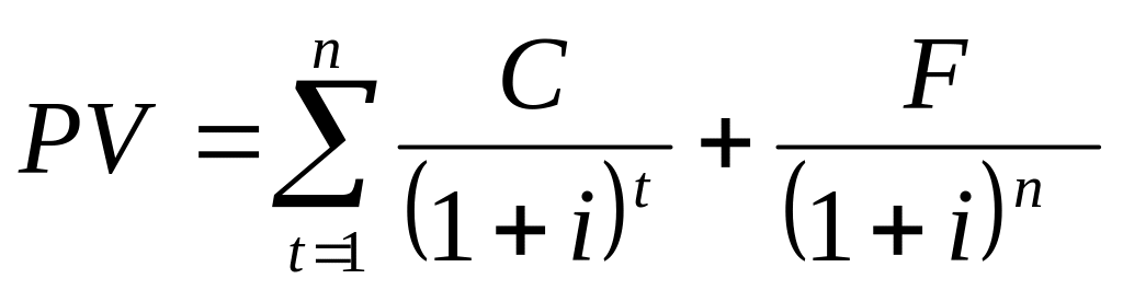 Тобто поточна реальна вартість облігації з періодичною виплатою відсотків дорівнює сумі всіх відсоткових надходжень по ній за період, що залишився, і номіналу, приведених до дійсної вартості по дисконтній ставці, рівній очікуваній нормі інвестиційного прибутку.