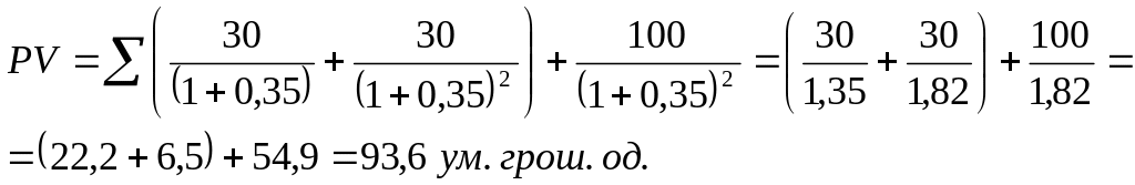 Приклад 29. На фондовому ринку пропонується до продажу облігація одного з підприємств за ціною 90 ум. грош. од. за одиницю. Вона була випущена строком на 3 роки, до погашення залишилося 2 роки. Її номінал при випуску визначений в 100 ум. грош. од. Процентні виплати по облігації здійснюються один раз на рік за ставкою 30% до номіналу. З урахуванням рівня ризику даного типу облігації очікувана норма інвестиційного прибутку приймається у розмірі 35% на рік.
