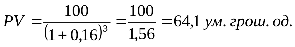 Приклад 31. Необхідно визначити поточну ринкову вартість облігації внутрішньої місцевої позики і зіставити її з ціною продажу, використовуючи наступні початкові дані: облігація номіналом в 100 ум. грош. од. реалізується за ціною 67,5 ум. грош. од. Погашення облігації передбачено через 3 роки. Норма інвестиційного прибутку очікується в розмірі 16%.