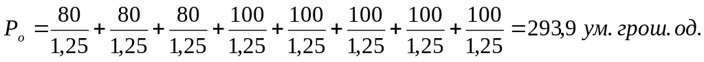 Приклад 34. Згідно за прийнятою дивідендною політикою компанія визначила виплату дивідендів у наступні три роки сумою 80 ум. грош. од. У наступні п’ять років вона зобов’язалася виплачувати постійні дивіденди в розмірі 100 ум. грош. од. Норма очікуваного прибутку (очікуваної дохідності) акцій даного типу складає 25 % на рік.