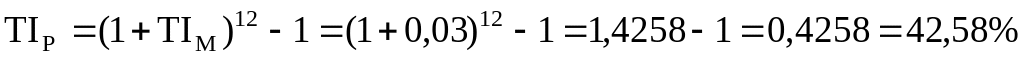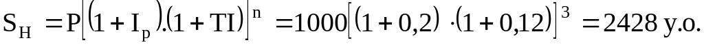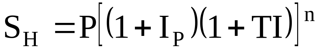 де SН – номінальна майбутня вартість вкладу (грошей) з урахуванням фактора інфляції; Р – початкова сума вкладу; ІР – реальна відсоткова ставка; ТІ – прогнозний темп інфляції; n – кількість інтервалів, за якими виконується кожний платіж.
