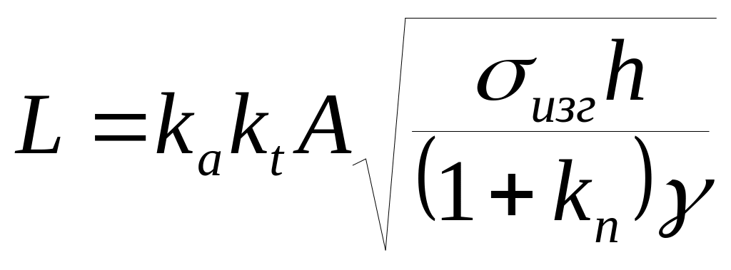 σр и σизг – пределы прочности на растяжение и изгиб пород несущего слоя мощностью h и объемным весом γ, kп – коэффициент пригрузки со стороны вышележащей толщи (kп =hi+1/hi <1), (kα и kt – коэффициенты, учитывающие угол падения пласта и устойчивость пролета во времени.