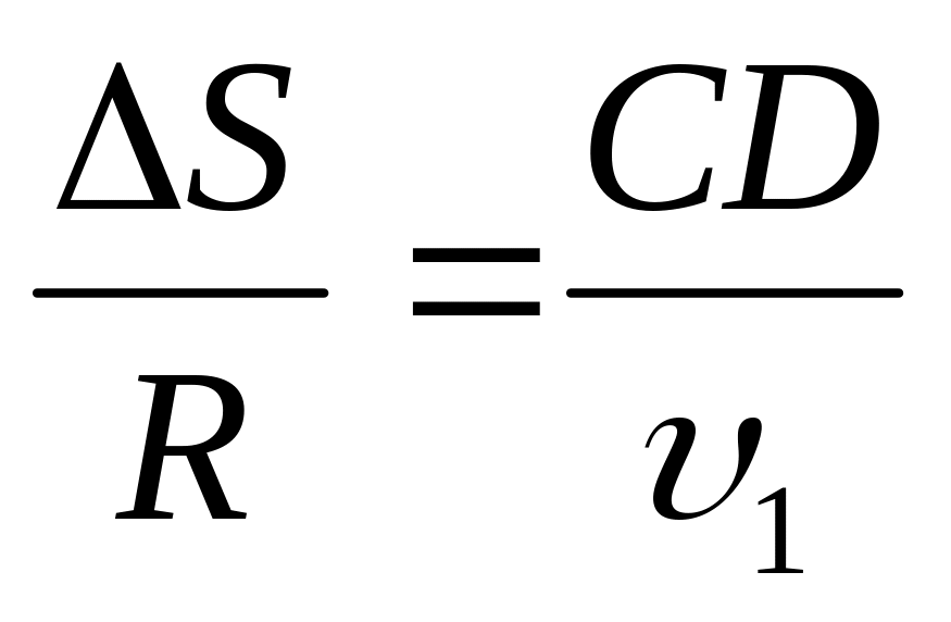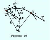 восстановим в точках М и N перпендикуляры к касательным до их пересечения в точке О (рисунок 10). Если Δt мало, то точки М и N близки, и дуга МN представляет собой отрезок окружности с радиусом кривизны R. R ≈ ОМ ≈ ОN и ΔS = RΔα. Угол СМD равен Δα, как углы с взаимно перпендикулярными сторонами. Из подобия треугольников МОN и СМD следует: