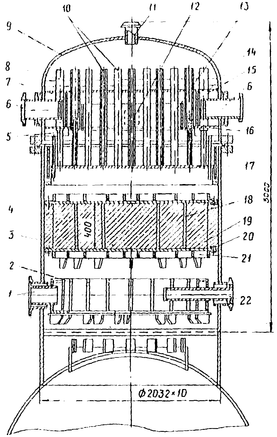 Пар подводится в нижнюю часть колонки через специальные патрубки 1 и 22. Пар распределяется посредством кольцевого короба 2 с равномерно расположенными в ней щелевыми отверстиями.