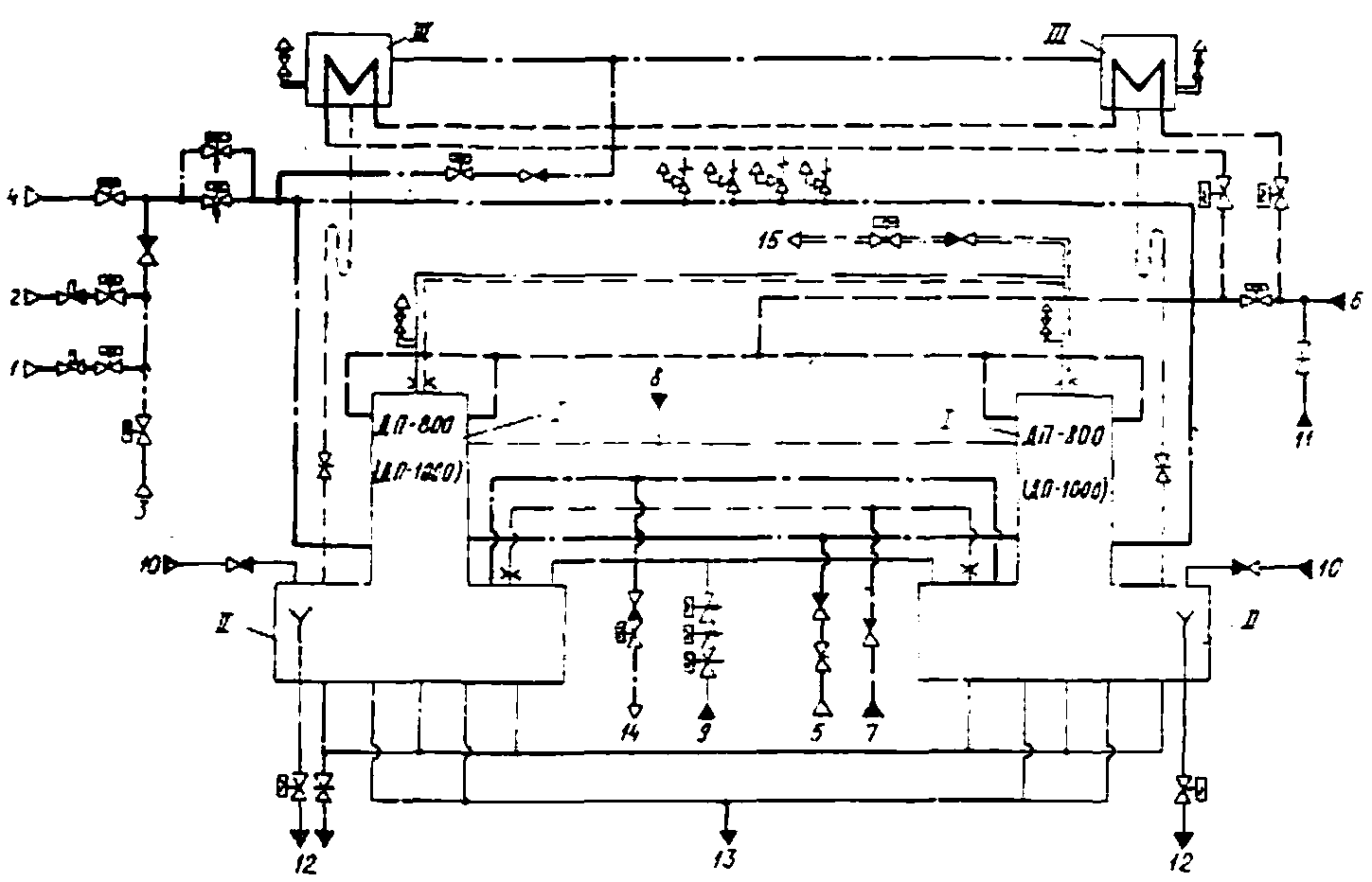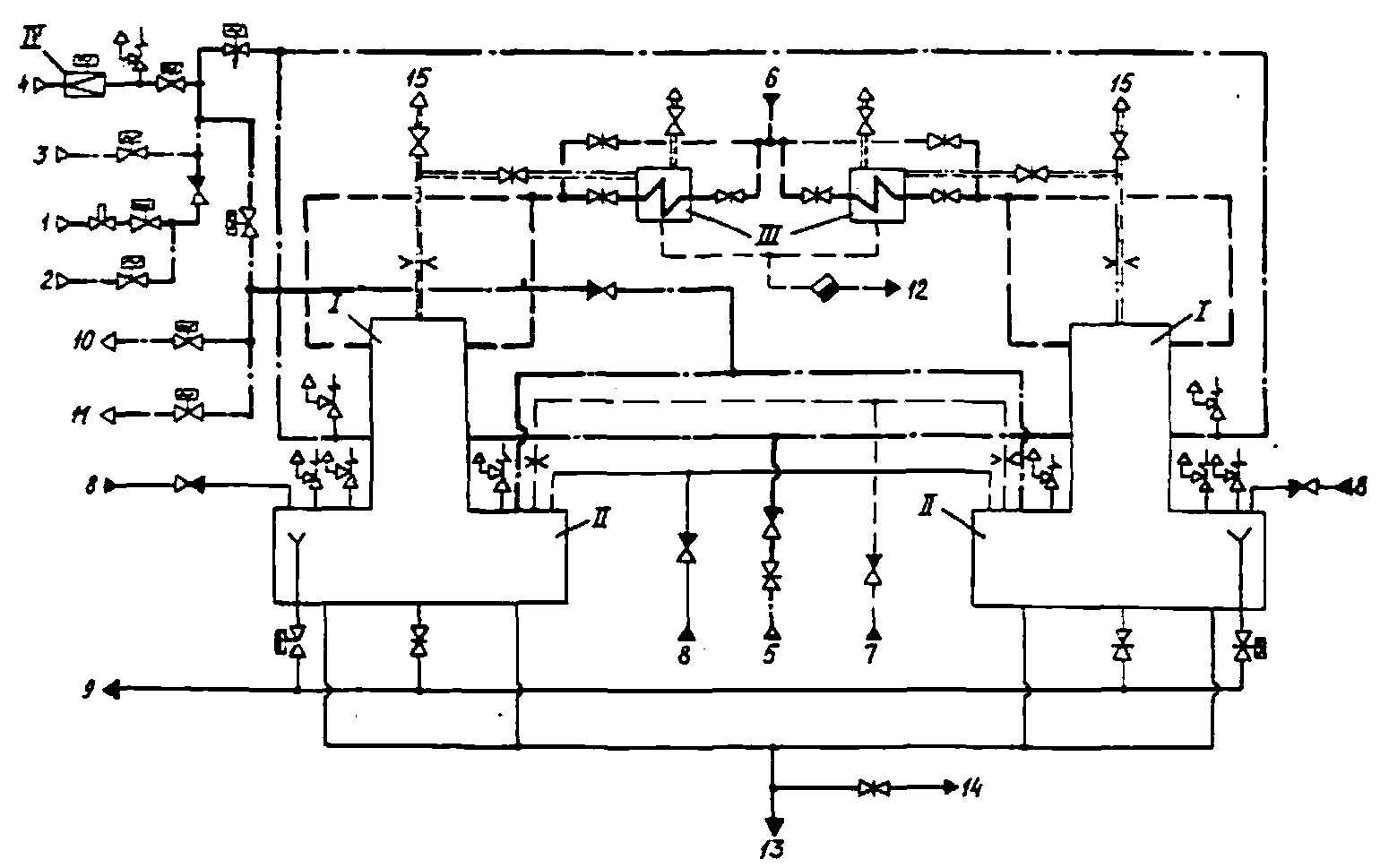I - деаэрационная колонка; II - бак-аккумулятор; III - коллектор собственных нужд;