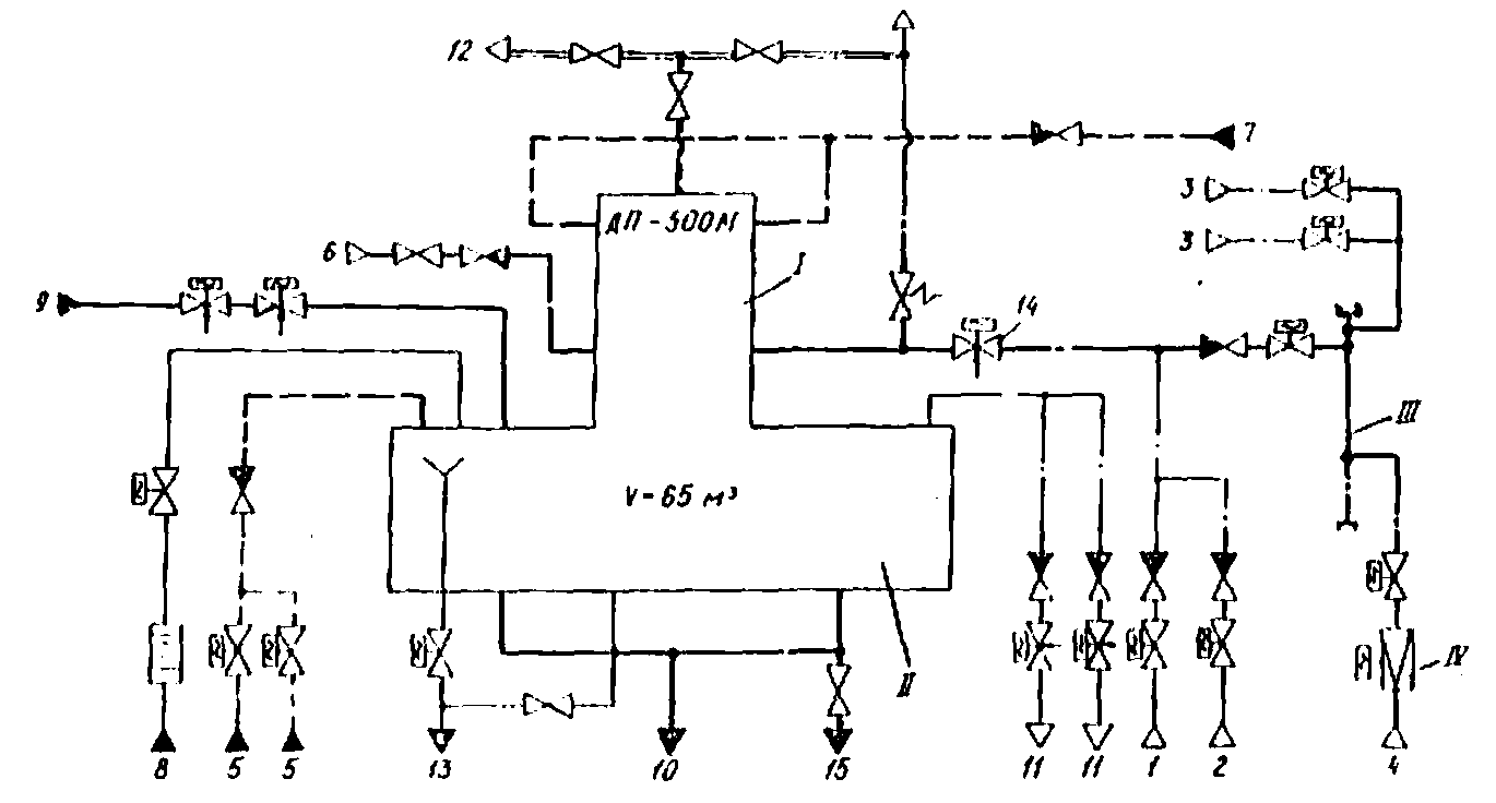 1 - пар от основного отбора турбины; 2 - пар от резервного отбора турбины; 3 - пар от резервного источника (коллектора собственных нужд); 4 - пар от ХПП; 5 - пар от штоков стопорных и регулирующих клапанов турбины; 6 - основной конденсат турбины; 7 - конденсат греющего пара от ПВД; 8 - линия рециркуляции ПЭН; 9 - опорожнение и перелив из бака-аккумулятора; 10 - пар на уплотнения; 11 - пар на эжекторы; 12 - дренаж из охладителей выпара; 13 - питательная вода к ПЭН; 14 - перемычка к сливным насосам ПНД-2; 15 - отвод выпара из колонки на утилизации