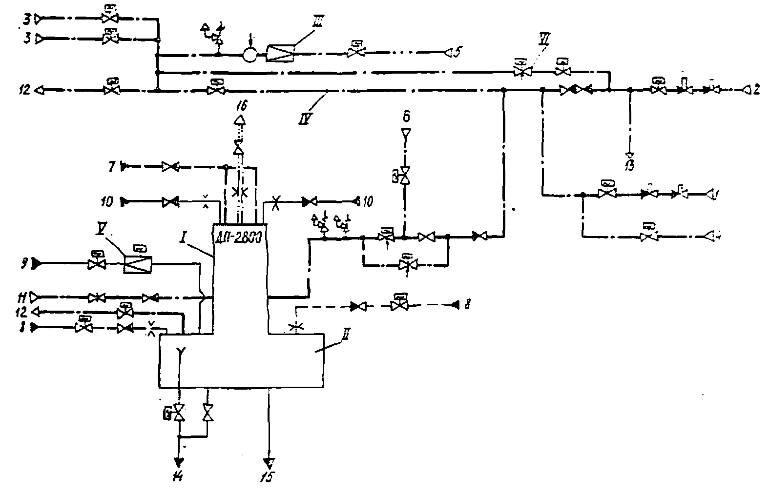 I - деаэрационная колонка; II -бак-аккумулятор; III - РОУ 40/13; IV - коллектор собственных нужд (КСН); V - дроссельный клапан; VI - шиберный клапан;