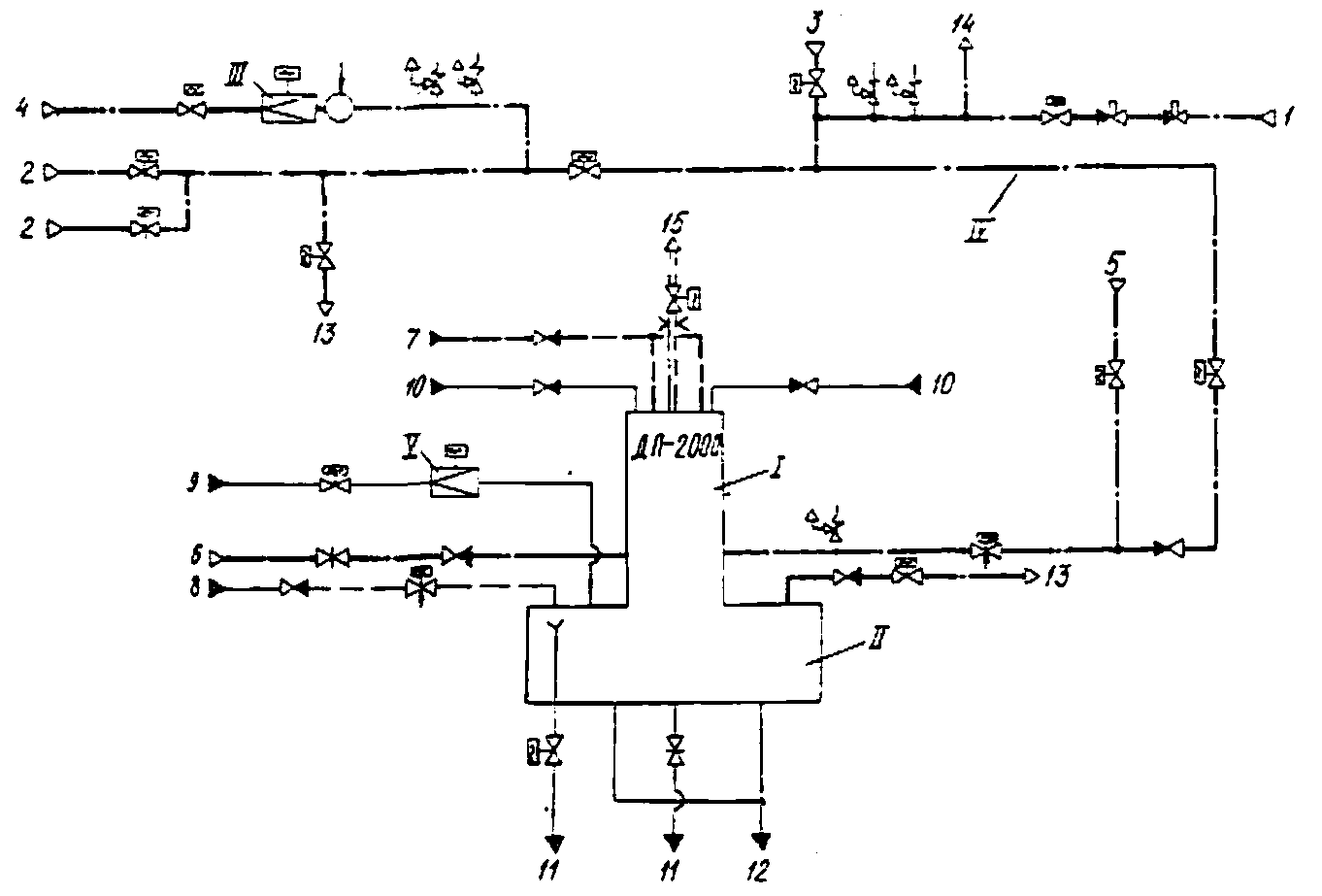 1 - пар от основного III отбора турбины; 2 - пар от резервного II отбора турбины; 3 - пар от резервного источника питания I общестанционных магистралей 1,3 МПа и 250 С; 4 - пар от главного паропровода; 5 - конденсат греющего пара ПВД; 6 - пар от штоков стопорных и регулирующих клапанов; 7 - основной конденсат турбины после ПНД; 8 - линия рециркуляции ПЭН; 9 - питательная вода от узла впрысков; 10 - питательная вода на всас ПЭН; 11 - пар на уплотнения турбины и эжекторы; 12 - отвод выпара из колонки на утилизацию; 13 - линия опорожнения и перелива из бака-аккумулятора; 14 - регулирующий клапан на подводе пара в деаэрационную колонку; 15 - на всас сливного насоса ПНД-3