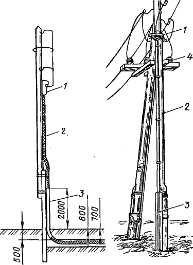 Вывод кабеля на опору для присоединения к ВЛ напряжением 10 кВ: 1 — концевая муфта, 2 — силовой кабель, 3— стальная труба, 4 — разрядник