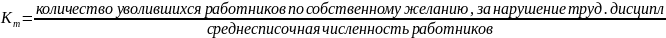 3) Коэффициент текучести кадров (Кт) − характеризует уровень увольнения работников по отрицательным причинам и определяется по формуле