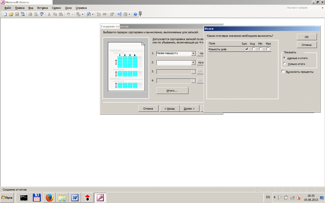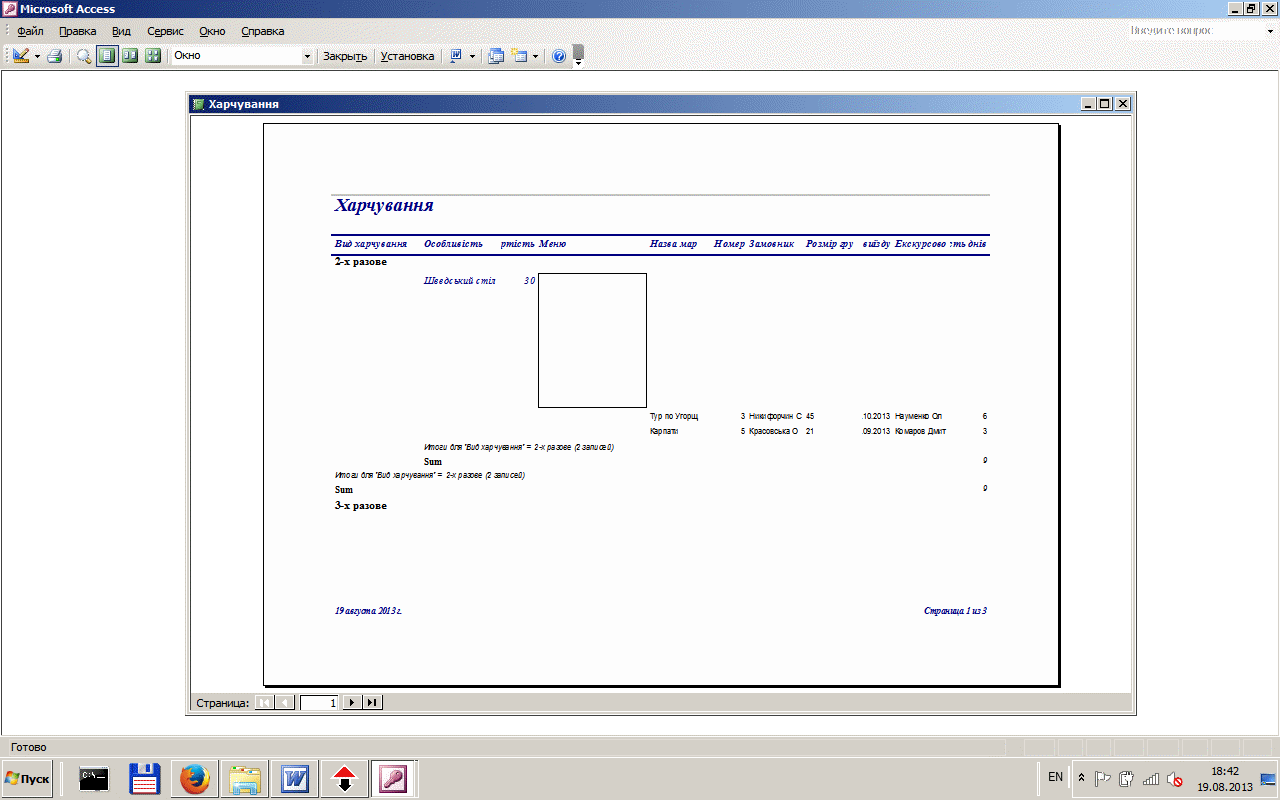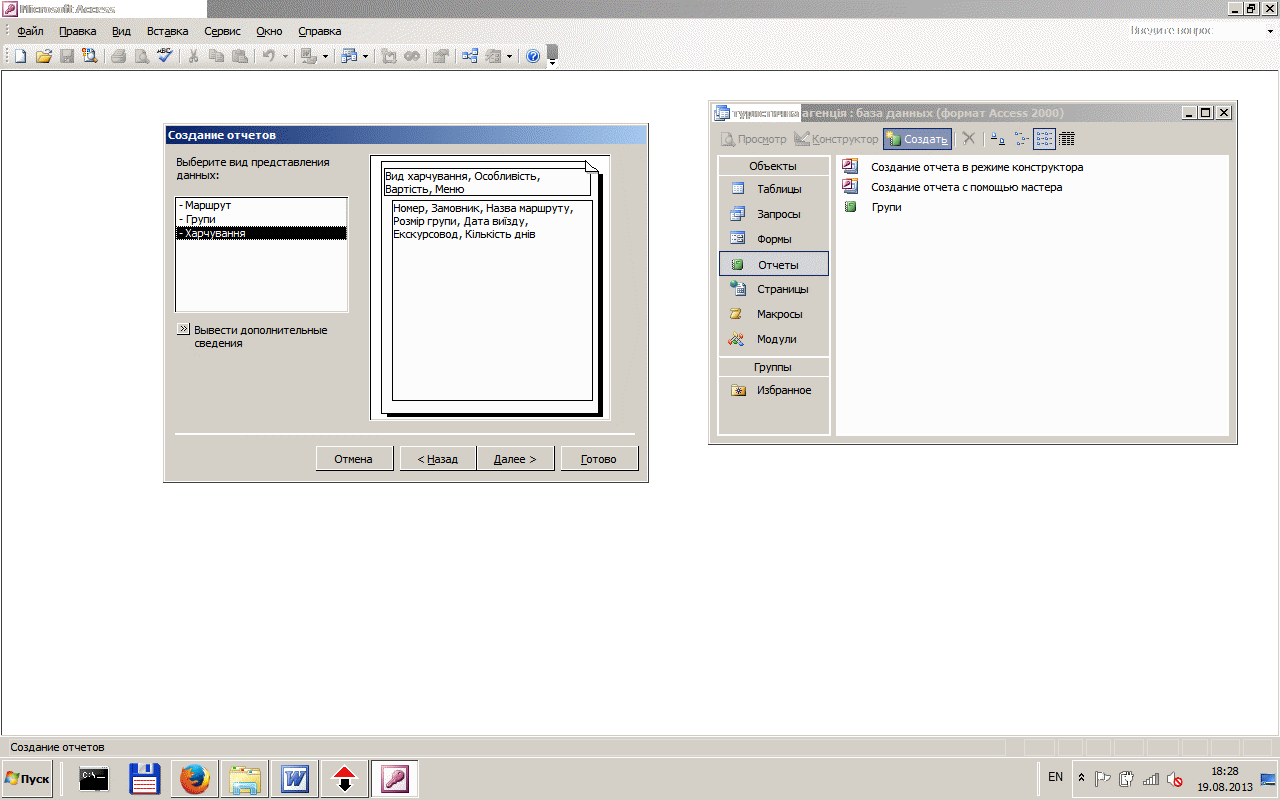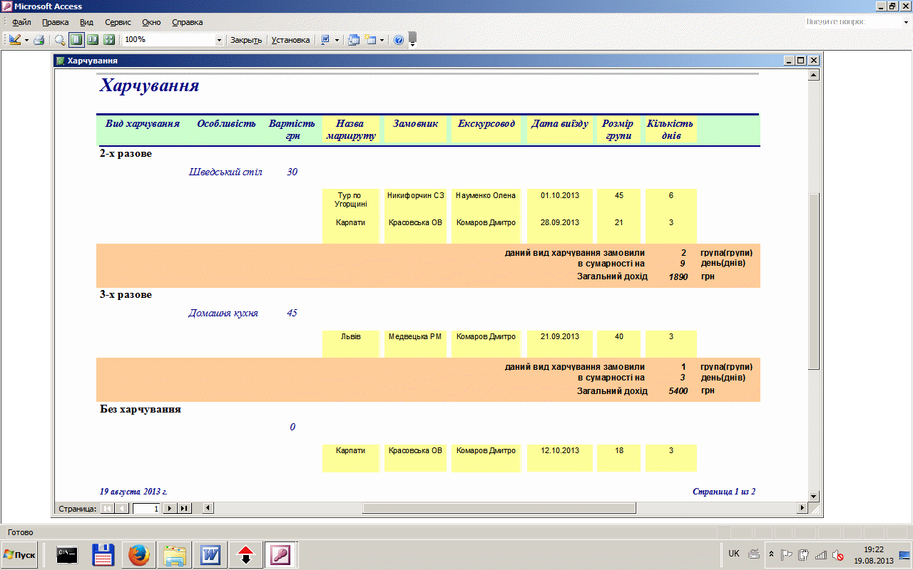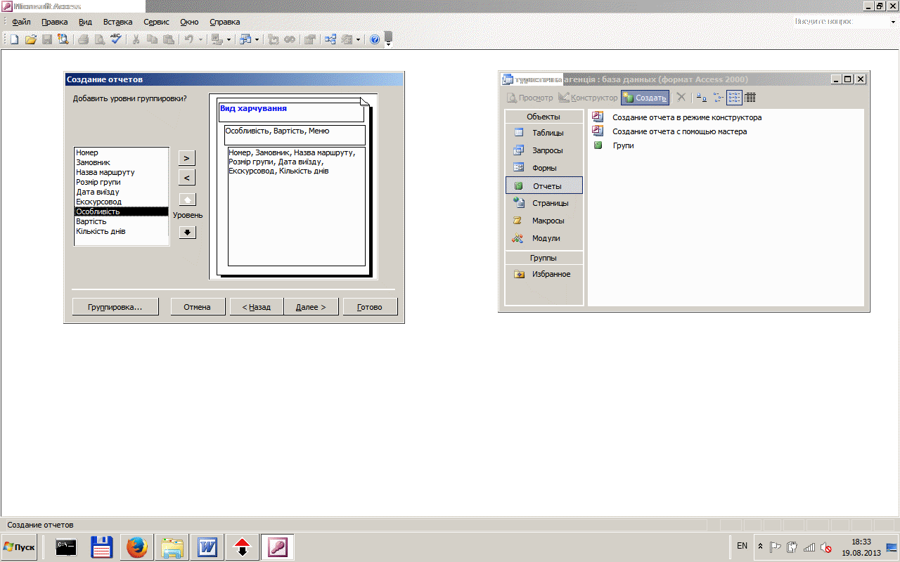 Для таблиць Групи, Харчування та Маршрут створити ще один звіт, за допомогою майстра звітів, який буде підраховувати Наскільки популярний той чи інший вид харчування, та який сумарний дохід він приніс