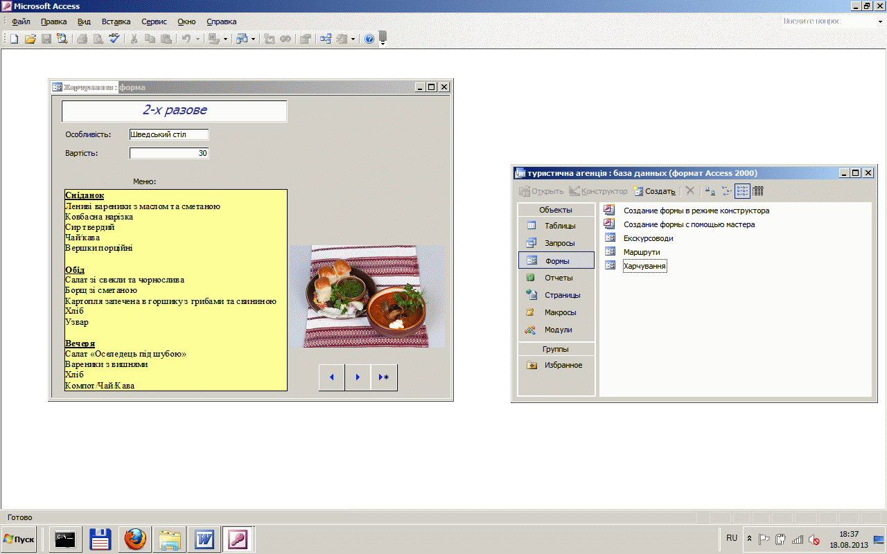 В таблицю Харчування добавити поле типу OLE з назвою Меню. Створити в текстовому процесорі Word 4 файли з описами всіх видів меню: 3-х разове домашня кухня, 3-х разове дієтичне харчування, 2-х разове шведський стіл, та без харчування. В таблицю Маршрути добавити поле Фото, та доповнити записи відповідними ілюстраціями. (малюнки повинні бути в форматі bmp)