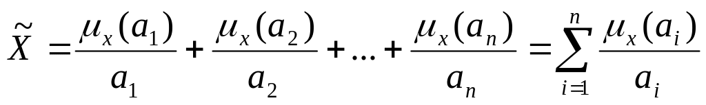 Використовують спеціальний запис нечітких множин. Якщо U є універсумом зі скінченною кількістю елементів, то можна подати так: