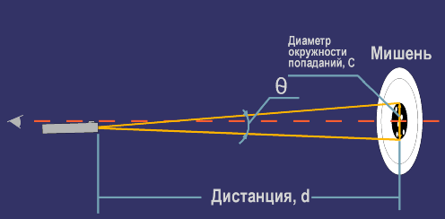 Как Вы видите, дистанция и диаметр окружности попаданий образуют треугольник, решая который, мы вычислим угол .