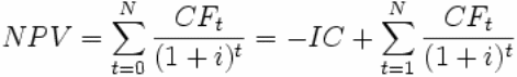 Иначе говоря, для потока платежей CF (Cash Flow), где CFt — платёж через t лет (t = 1,...,N) и начальной инвестиции IC (Invested Capital) в размере IC = − CF0 чистый дисконтированный доход NPV рассчитывается по формуле: