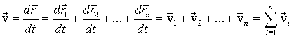 Закон сложения скоростей. Если материальная точка одновременно участвует в нескольких движениях, то результирующее перемещения в соответствии с законом независимости движения, равно векторной (геометрической) сумме элементарных перемещений, обусловленных каждым из этих движений в отдельности: