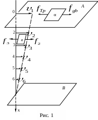 На рис.1 зображена одинична площадка α на поверхні А і показані прикладені до неї сили: зовнішня рушійна сила fgb і сила внутрішнього тертя fТр . В результаті зрівноваження вказаних сил (fgb = − fgb ), коли поверхня А рухається рівномірно.