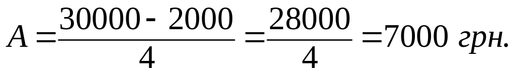 Наприклад, якщо початкова вартість об’єкту основних засобів складає 30000 грн., термін використання 4 роки, а очікувана ліквідаційна вартість буде дорівнювати 2000 грн., тоді річна сума амортизаційних відрахувань становить: