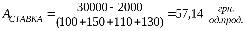 Наприклад, якщо за перший рік використання об’єкту основних засобів було виготовлено 100 одиниць продукції, за другий – 150 одиниць продукції, за третій – 110 одиниць продукції, а за четвертий – 130, початкова вартість дорівнює 30000 грн., а ліквідаційна вартість – 2000 грн., тоді виробнича ставка буде дорівнювати: