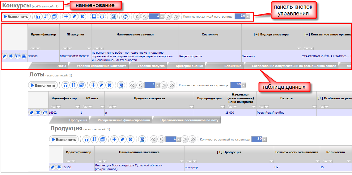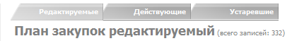 В интерфейсах документов: планов-графиков, заявок, закупок по всем способам определения поставщика, сведений о контрактах, то над наименованием заголовка интерфейса присутствуют три вкладки: