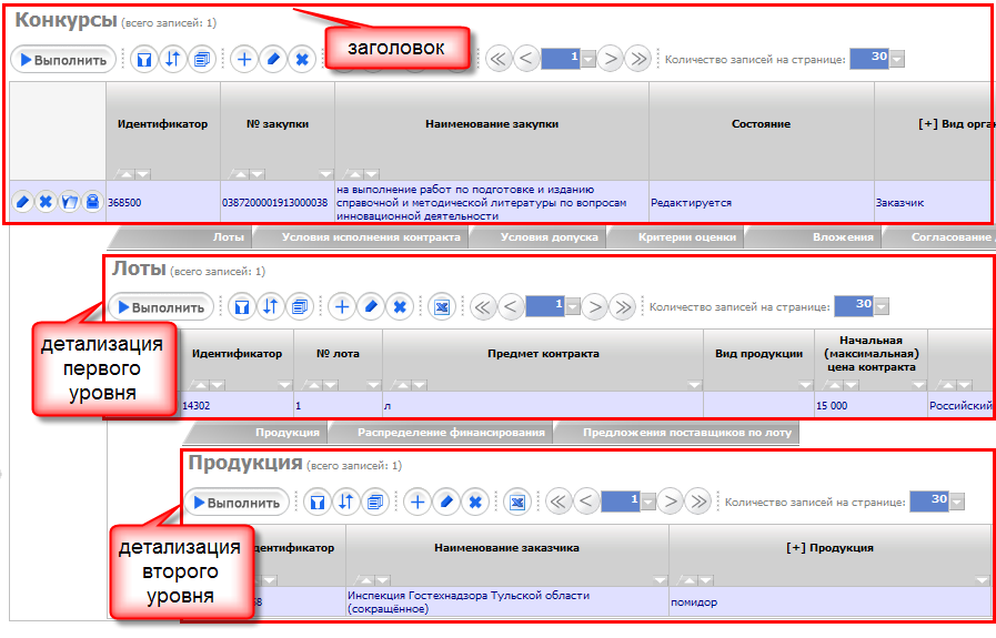 слева от записи в таблице данных. Для закрытия детализации нужно повторно нажать кнопку . Заголовок и каждая детализация представляют собой отдельную таблицу данных.