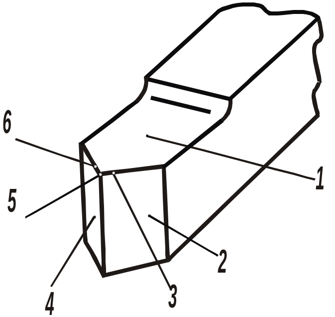 4 – вспомогательная задняя поверхность, которая обращена к обработанной поверхности;